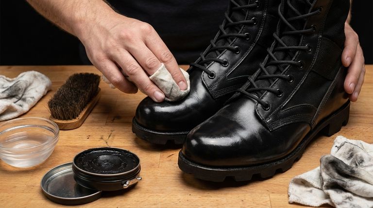 Pour obtenir une finition brillante sur des bottes militaires, la méthode principale consiste à appliquer méticuleusement de fines couches uniformes de cirage de haute qualité et à les lustrer pour créer une surface lisse et réfléchissante. Ce processus remplit systématiquement les pores naturels du cuir pour produire la brillance souhaitée.