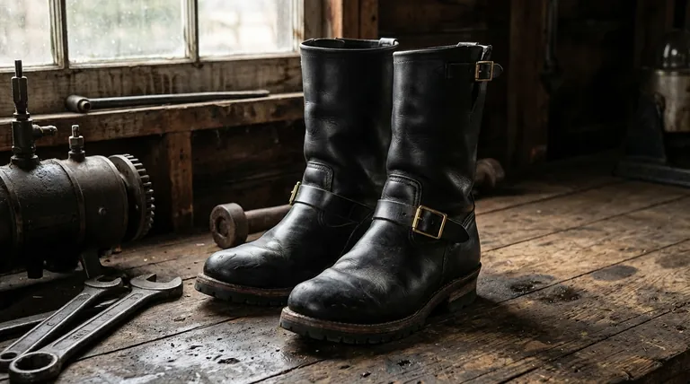 La conception de la botte d'ingénieur est un reflet direct de son objectif initial. Créée pour des travailleurs comme les ingénieurs de chemin de fer et les pompiers, la construction sans lacets et le système de boucles offraient une sécurité essentielle, empêchant l'enchevêtrement dans les machines tout en offrant une protection robuste contre la chaleur et les impacts.