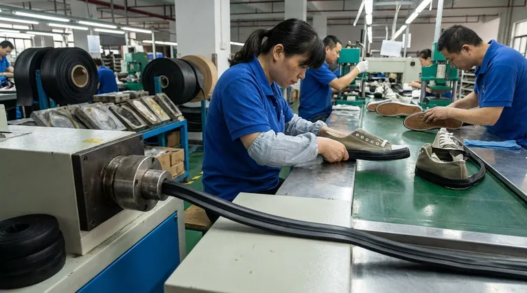 Le renfort est principalement fabriqué par un processus appelé extrusion. Contrairement à la semelle extérieure, qui est souvent moulée ou calandrée, le renfort est créé en forçant le matériau en caoutchouc à travers une filière pour former une bande continue et profilée. Cette bande sert de paroi latérale critique qui relie l'empeigne de la chaussure à la semelle.