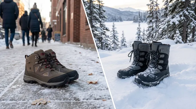 Une botte d'hiver offre une chaleur essentielle pour les journées froides typiques en ville, mais peut manquer de l'isolation robuste nécessaire pour une exposition prolongée à des températures glaciales.